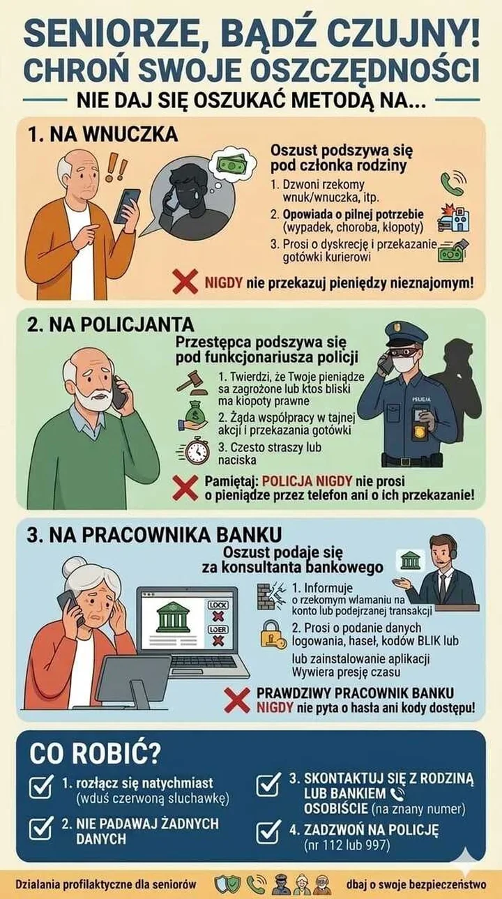 Komenda Powiatowa Policji w Zgierzu prowadzi liczne działania profilaktyczne i przypomina o podstawowych zasadach ostrożności. Funkcjonariusze skupiają się przede wszystkim na edukowaniu mieszkańców, bo to właśnie świadomość ma największe znaczenie dla bezpieczeństwa osób starszych, które najczęściej stają się celem takich prób.