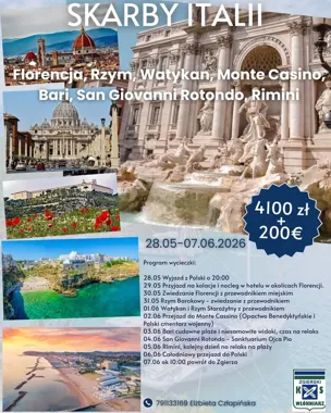 Chcesz poczuć Włochy w pigułce: od renesansowej Florencji, przez barokowy i starożytny Rzym, po południowe Bari i plaże Rimini? Ta wycieczka to intensywny miks zabytków, duchowych miejsc i chwili relaksu nad morzem — warto się zapisać! Zapisz się przez telefon, by zarezerwować miejsce.